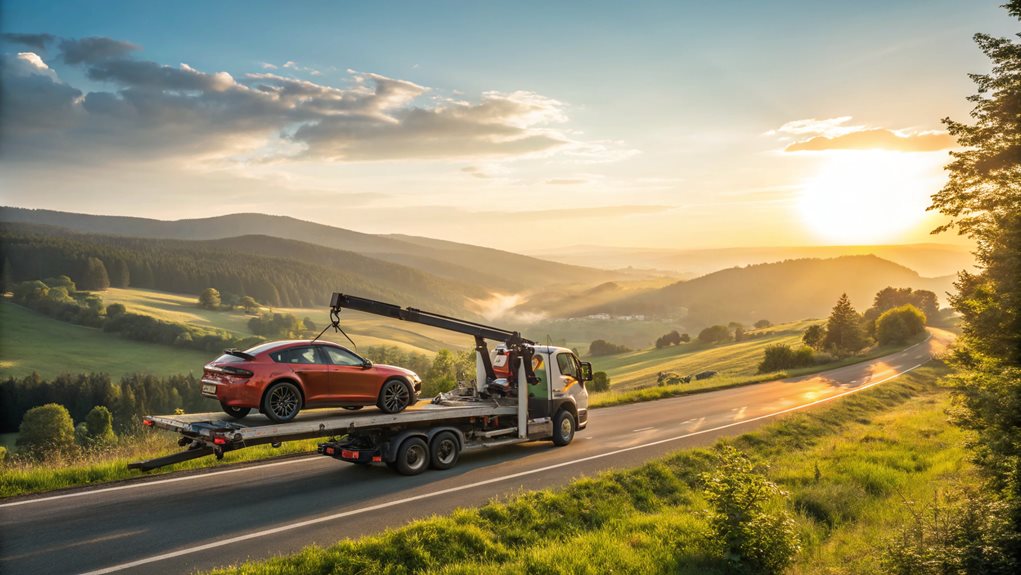 Many factors contribute to guaranteeing vehicle safety during towing, and secure transportation methods play a critical role. Utilizing the right towing equipment, compatible with the vehicle's weight and size, guarantees stability and prevents damage. Compliance with manufacturer's towing recommendations maintains structural integrity. Regular checks for wear and tear in towing gear ensure reliability. Positioning equipment to maintain a level vehicle gesture mitigates swaying risks. Balanced load distribution enhances stability during transit. By placing heavier items near the hitch and guaranteeing even weight distribution, tilting is avoided. Safe driving practices such as increased following distance and careful maneuvering improve overall safety. Additionally, routine maintenance and pre-trip checks like tire pressure and light operations confirm all aspects are in perfect condition.